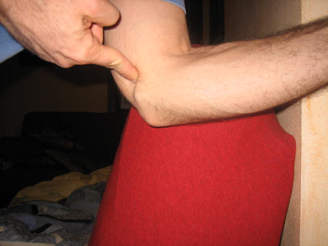 Le prime tre fotografie (6825, 6827 e 6828) indicano il punto che mi duole, in realtà sembra essere più una piccola zona circoscritta intorno e dietro all'osso sporgente del gomito (credo si chiami ulna), mi fa male alla pressione e maggiormente alla mattina appena alzato.