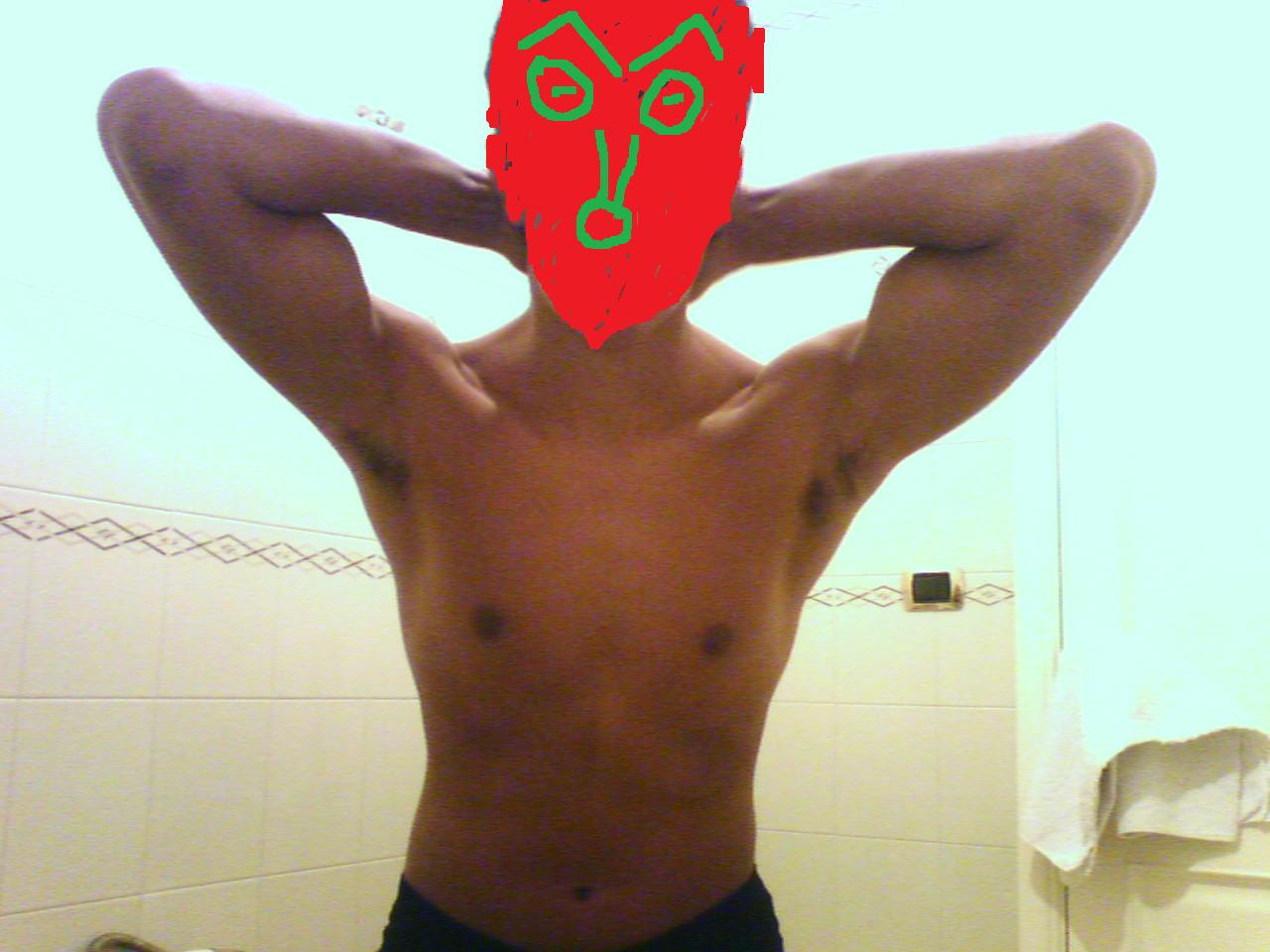 ho 17 anni e posto delle mie foto dopo 6 mesi di palestra.....i risultati nel mio piccolo gli ho fatti infatti prima ero 178x52 kg,ora dopo 6 mesi sono 178x58kg(6 kg di massa magra)...commentate le mie foto ma non demoralizzatemi visto che sono già tanto demoralizzato perchè il mio fisico ha una bruttissima genetica(leggera malformazione di pectus exscavation,non sò se si dice cosi comunque è un piccolo bozzo nello sterno;poi ho il trapezio sporgente;e per finire ho le scapole alate e mi sembra anche una "cifosi"(la prossima volta che andrò in palestra lo dirò al mio istruttore che fà anche fisioterapia)