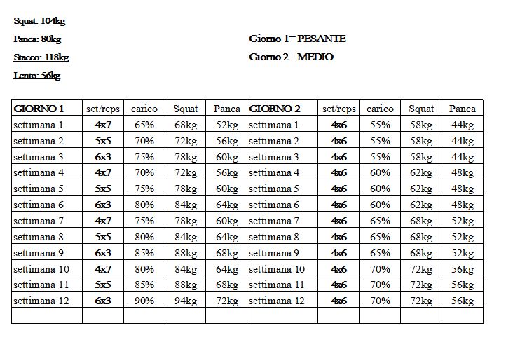 -Massimali: Squat 104 - Panca 80 - Stacco 118 - Lento 56
