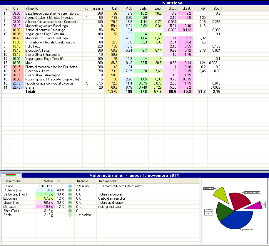 Vi posto la dieta che stavo buttando giù proprio in questi minuti, il problema è che sfiora le 2.000 calorie quindi mi dovreste dare una mano per far saltare fuori le 200 calorie mancanti che dovranno essere principalmente proteine visto che a livello di carboidrati sto a posto (non voglio superare i 150 gr diari), mancano anche un 5-10 gr di grassi volendo, mi sono imposto il limite a 75 gr di grassi diari, ora sono a quasi 67.