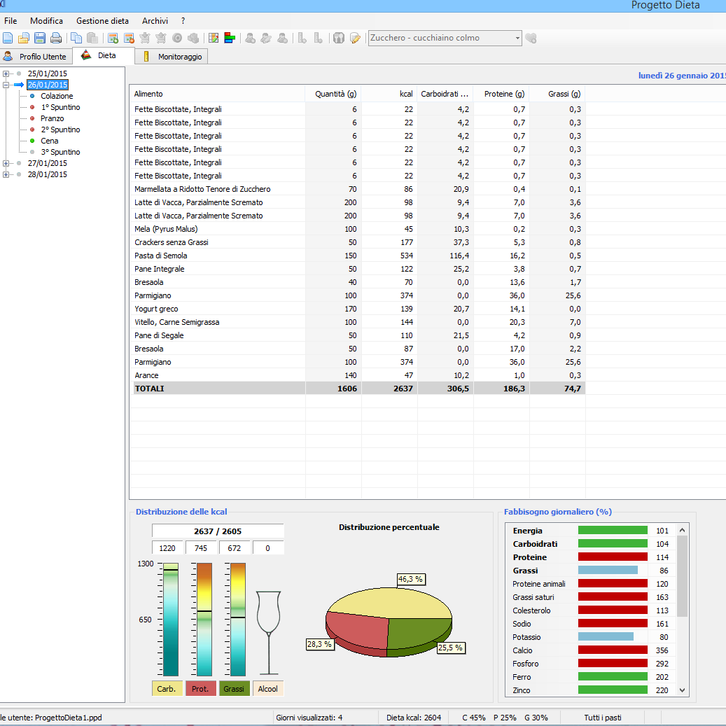 Arrivato ad oggi ho utilizzato il programma consigliatomi su questo forum di nome "Progetto Dieta" per stilare all'incirca la mia alimentazione durante una normalissima giornata...