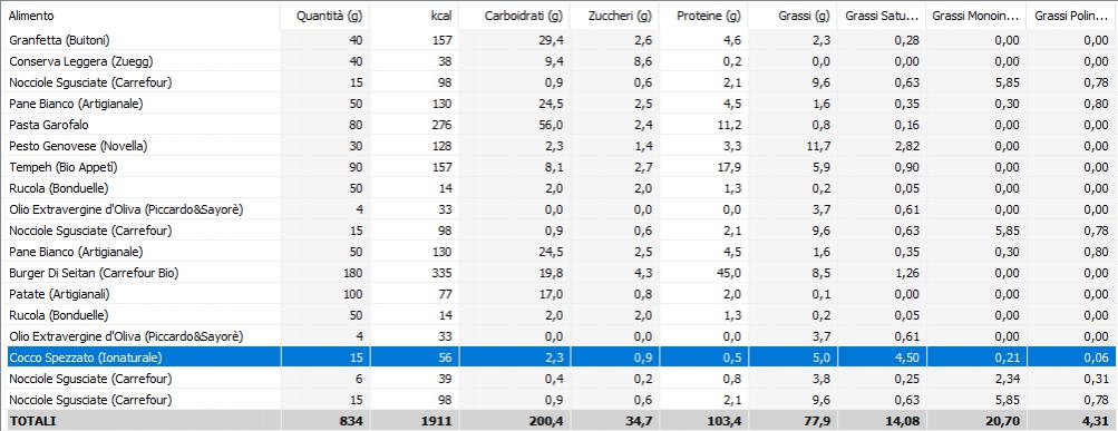 - GRASSI --> E' qui che ho le maggiori difficoltà, arrivo ad un totale di 78g di grassi (dovrei assumerne circa 53g), non riuscendo a soddisfare comunque il fabbisogno di grassi insaturi (mi mancano 11g) per quanto riguarda i grassi saturi arrivo alla quantità desiderata (15g) ma per farlo, come detto prima, sono costretto ad aumentare i grassi totali.