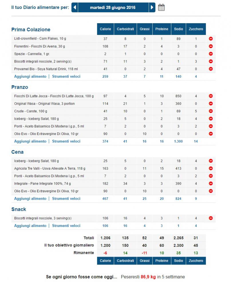 Comunque ho fatto un diario alimentare su myfitnesspal, prendendo valori sia dalle scatole dei prodotti che da siti su internet, e spannometricamente posso dire che questi sono i miei ultimi giorni alimentari: