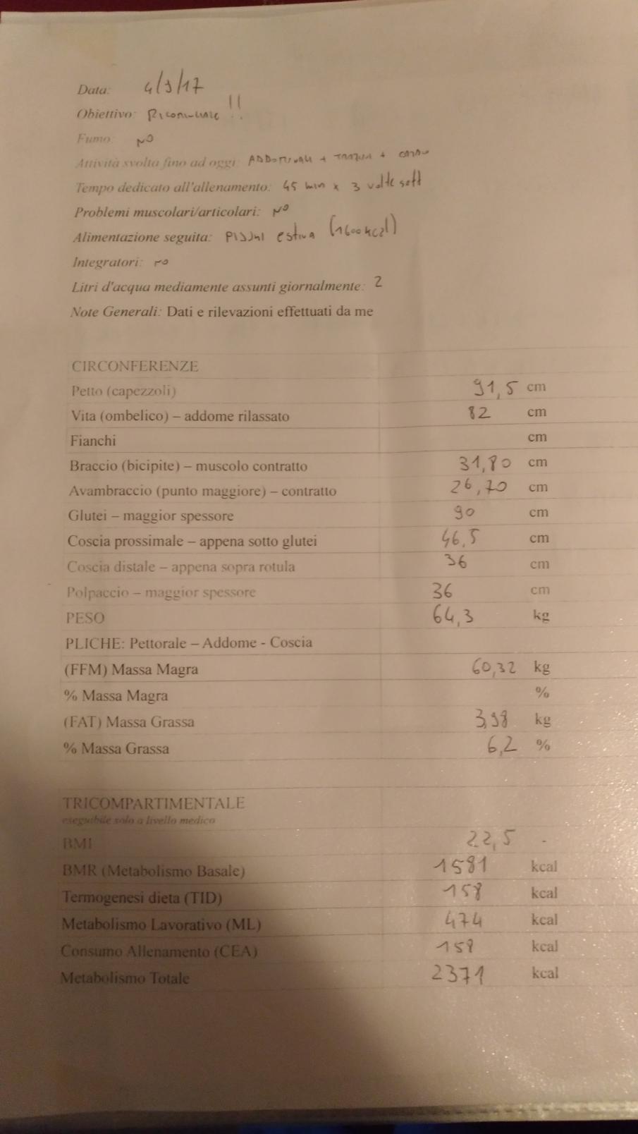 - Stamattina mi sono ripesato e peso 64.2 kg, addirittura meno di quando sono partito!! So che 100 grammi sono un'eresia, so anche che trarre conclusioni adesso è prematuro e affrettato ma sono andato un po' nel panico. Starò sbagliando qualcosa? Gli strumenti (il plicometro ad esempio) con il quale ho effettuato le varie misurazioni non sono strumenti professionali e ho la paura che non siano precisi e sballino le misuazioni. Voi che ne dite?