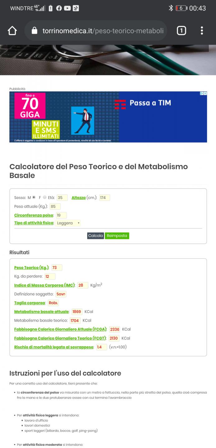 Intanto grazie mille per la risposta, per quanto riguarda la formula io avevo utilizzato quella nel link e seguendo l'indicazione di utilizzare non il peso totale ma quello della massa magra per questo ottenevo un fabbisogno di 1472 kcal, adesso mi chiedo quale è corretto?
