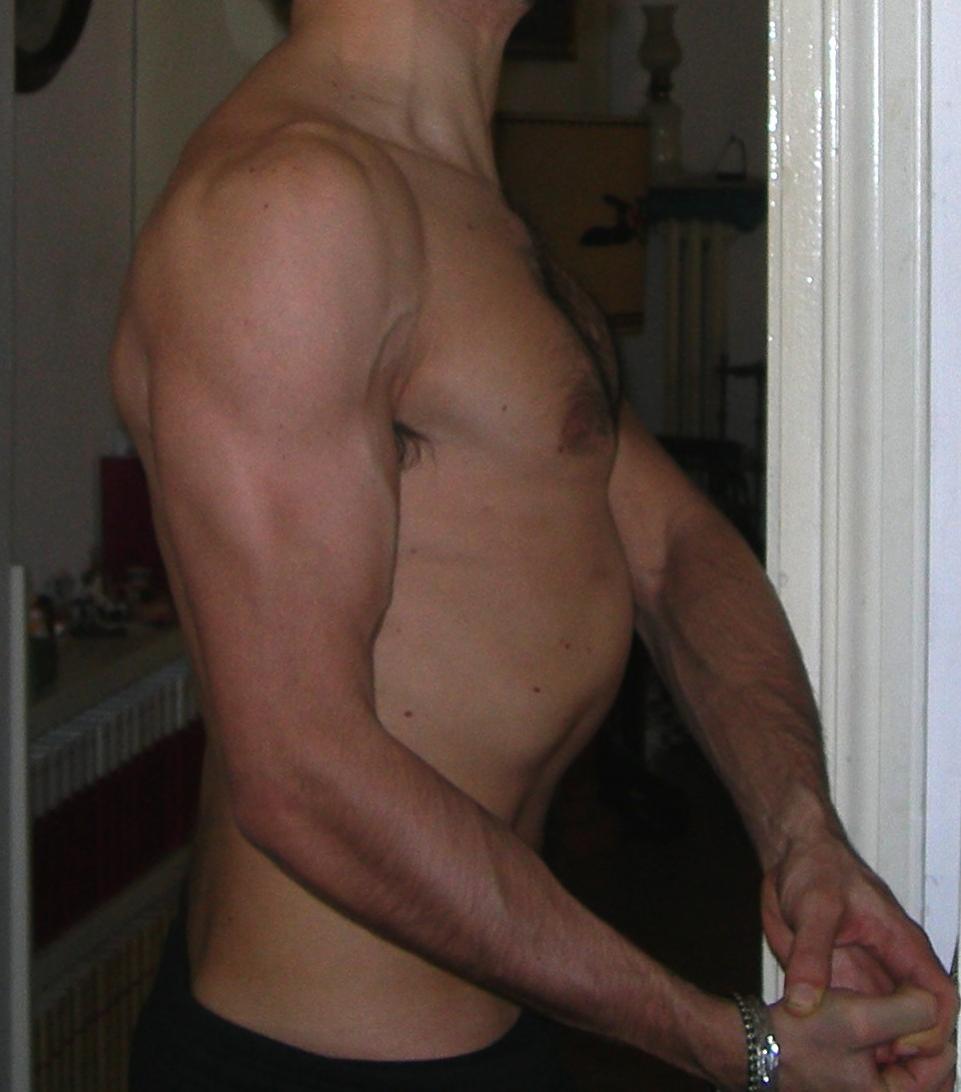 Stessa questione per i bicipiti, curl: da tempo utilizzo 10 chili per braccio, e non riesco ad aumentare... cosa fare? Vi posto un bel po' di foto della parte superiore, che potrebbero rivelarsi utili: a me sembra strano non riuscire a superare i 35 di panca piana... magari poi voi mi dite che per un fisico così e quattro mesi d' esperienza è normalissimo...