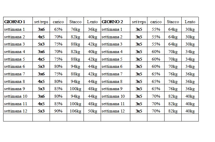 -Massimali: Squat 104 - Panca 80 - Stacco 118 - Lento 56
