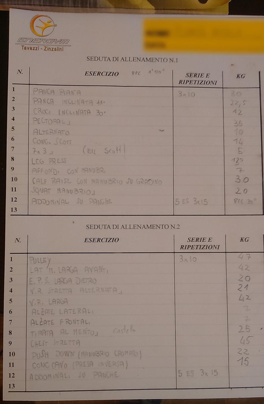 siccome sto rimettendo un po' in discussione tutto il discorso allenamento mi sembrava doveroso pubblicare anche la foto della scheda da'allenamento che attualmente sto seguendo in palestra. La scheda è aggiornata ad oggi!