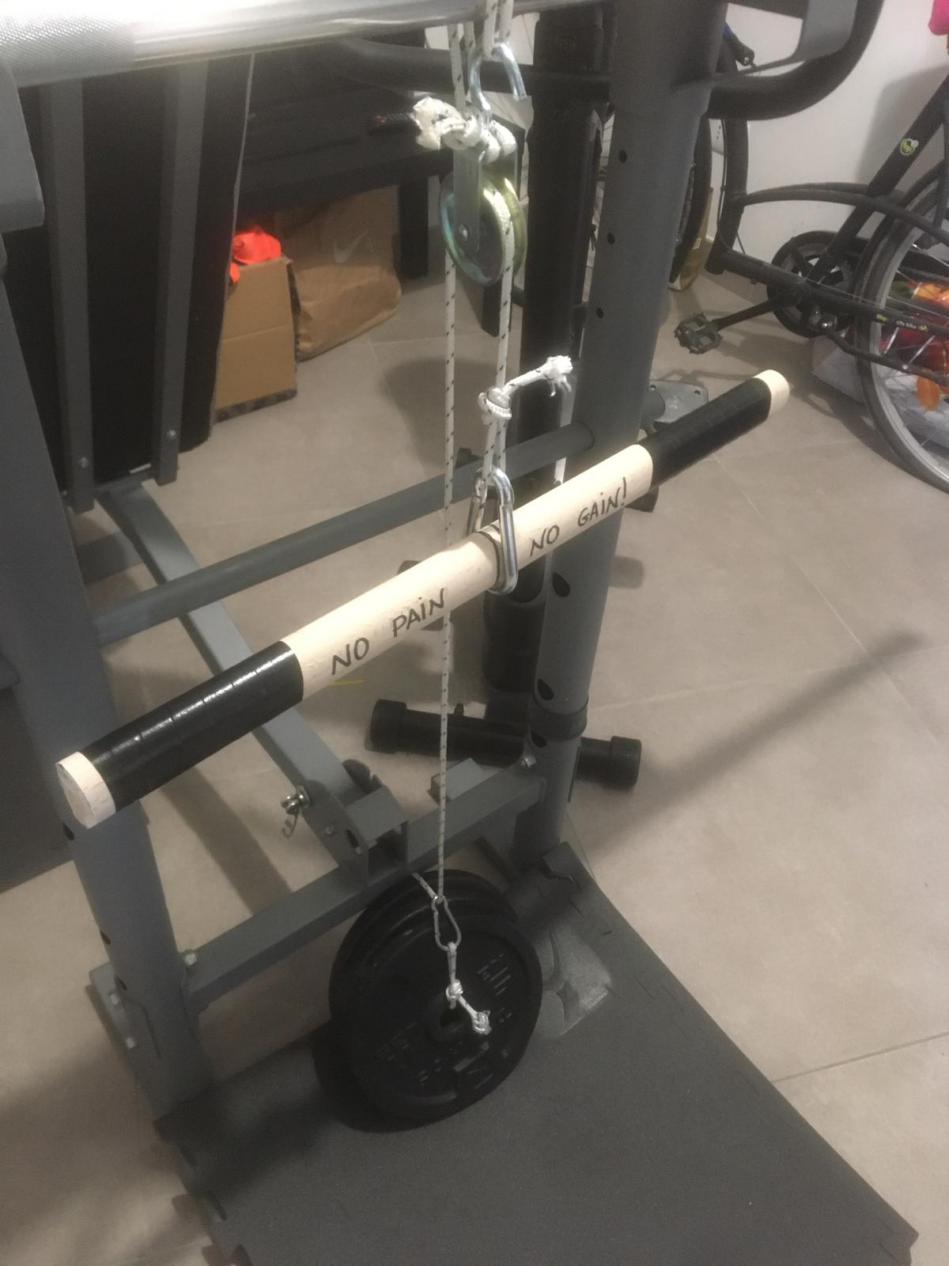 Oggi ho provato a fare lo stesso a casa, ecco il risultato. Spero possa essere da spunto per altri utenti, il mio diciamo è adatto per 20/25kg al massimo, però usando materiali più grossi e resistenti si può sollevare una nave. Con un altezza maggiore, ad esempio usando un grosso ramo o una trave si può costruire alta ed utilizzarla per una miriade di esercizi.