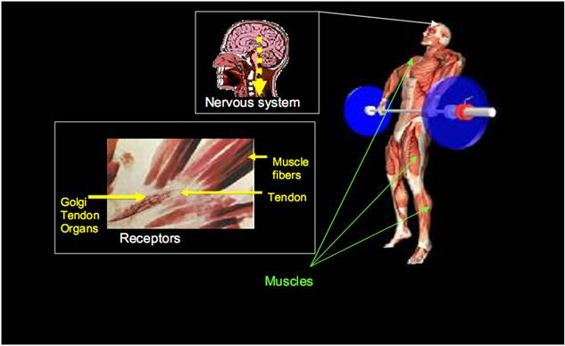 B) Recettori muscolari: alcuni recettori attueranno un freno che inibirà la capacità di generare forza. Conosciuto come organi del Golgi, questo attua, come meccanismo protettivo, lo “shutdown”(l’esclusione/disattivazione) parziale del muscolo in tensione, se questa è elevata. Altri recettori che fungono da blocco, incrementano la produzione di forza creando però un effetto elastico (riflesso miotatico) quando il muscolo viene stirato.