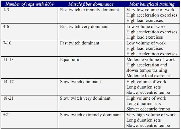 Questo è un vecchio, ma ancora buon metodo. E’ probabilmente il più facile e la via più obiettiva per determinare il tipo di fibre muscolari. La procedura è semplice, dopo un appropriato riscaldamento, caricare la barra con l’80% dal massimale e cercare di fare il maggior numero di serie possibile con buona tecnica. La tabella sotto aiuterà a ottenere un risultato: