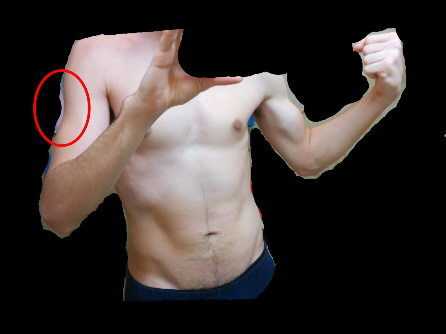 2) Li dove c'è il cerchietto rosso è un punto molto particolare dove sento come se ci fosse un "Buco", il punto si trova tra spalla, bicipite e tricipite... Come posso evitare che si formi questo "buco"? C'è un moscolo in particolare che devo allenare oppure basta insistere su bicipite e tricipite?