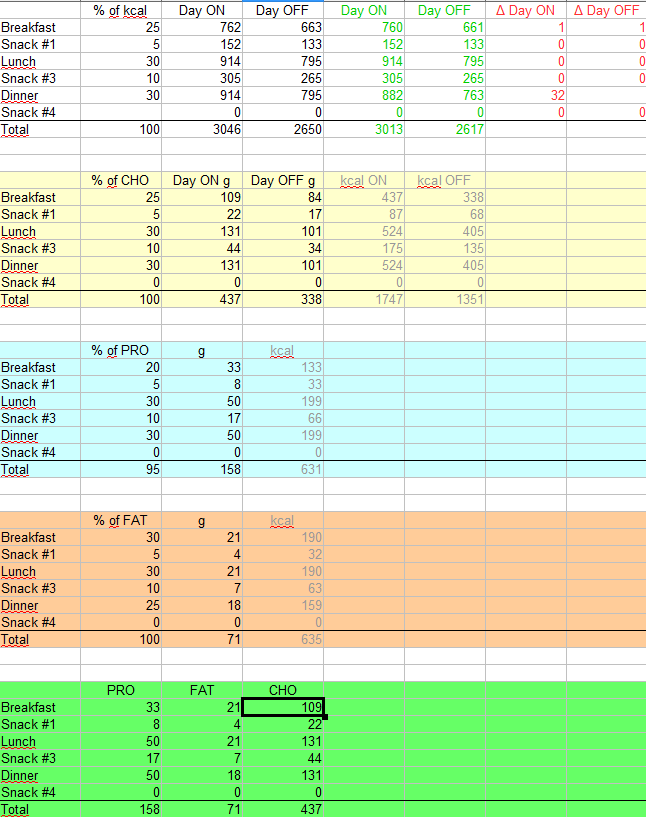 Facendo macinare tutto al buon excel (che potete scaricare qui https://drive.google.com/file/d/0B22...ew?usp=sharing, si sa mai che a qualcuno può servire) trovo che mi servirebbero circa 3000kcal nei giorni ON e, visto che non sono magro, 2600 nei giorni off.