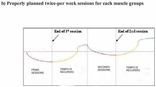 Se hai più di 5 giorni tra una sessione e la successiva bisogna accertarsi di avare un elevato volume di lavoro per ognuna. Perché? Perché c’è troppo riposo tra le sessioni per lo stress causato, bisogna imprimere, se non si vuole tornare alla base.(anche detta INVOLUZIONE).