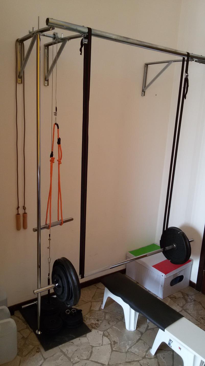 Ho preso anche una carrucola per fare gli esercizi con il cavo basso. La carrucola andrebbe vincolata ad un supporto da bloccare con il piedi (ed il proprio peso) non potendo forare il pavimento. Ho provato ma ho rotto il tubo a cui avevo bloccato la carrucola ... vedremo per ora faccio i bicipiti con il cavo alto stando sotto-sopra !-P