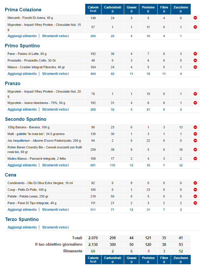La dieta l'ho strutturata cosi, 2100 Kcal 300g carb - 120g prot - 50g fat inizio cosi e in base a come cresco aumenterò.