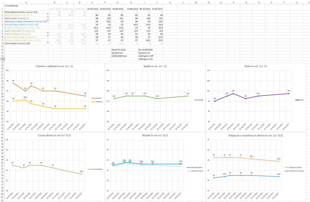 Per farmi un'idea migliore della situazione ho creato dei diagrammi basati sui dati che ho raccolto negli ultimi mesi, sia per quanto riguarda la composizione corporeea, sia delle circonferenze delle parti principali del corpo.