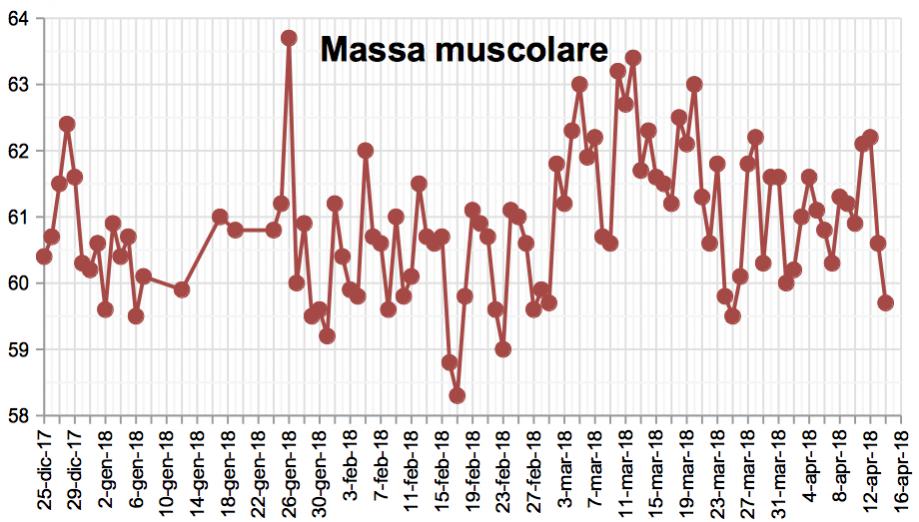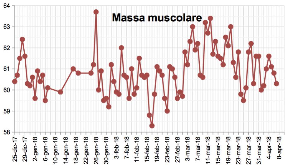 La massa magra si può dire che è sempre 61 kg con oscillazioni sia nel breve che nel medio periodo.