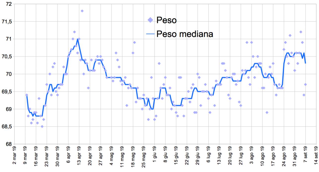 ero contento di aver superato i 70 kg, invece le ultime due misure, ancora una volta sono sceso sotto i 70 kg. Oscillazioni? Speriamo.