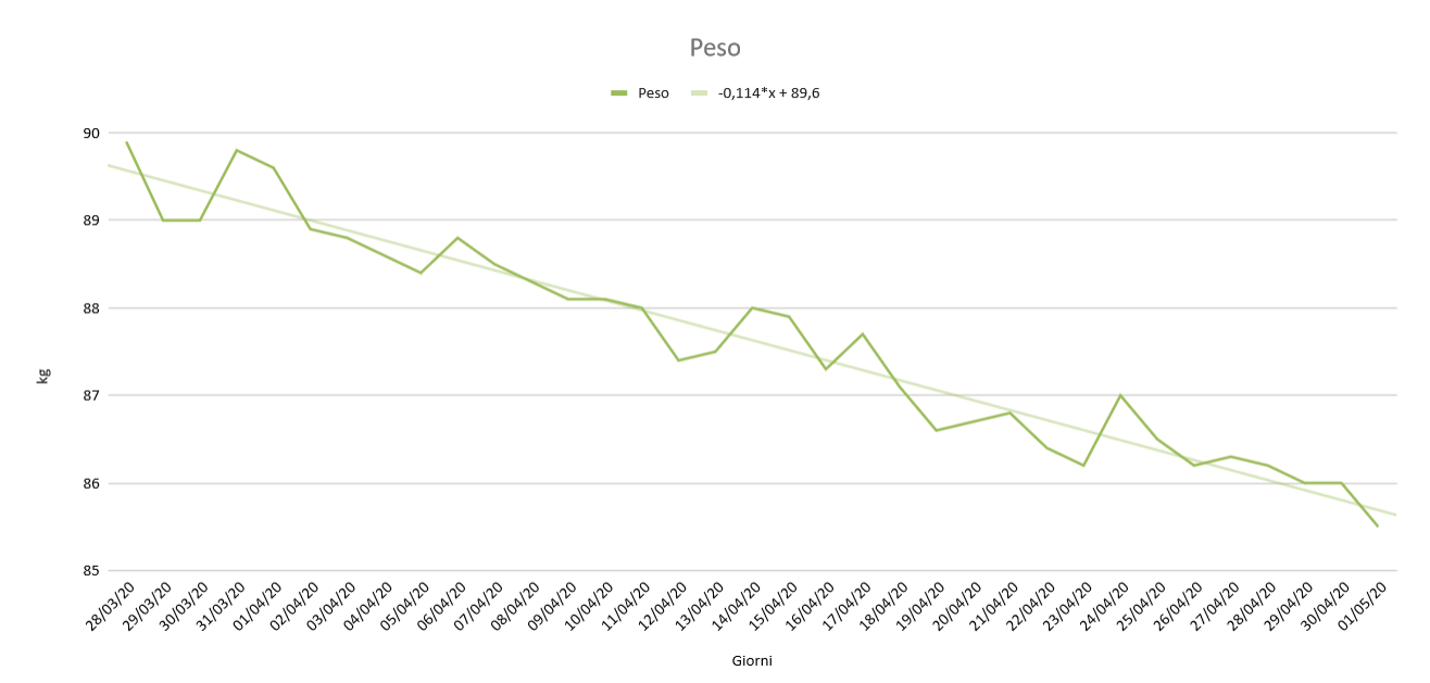Nei miei progetti pre-chiusura c'era già l'idea di partire con una fase di ipocalorica a maggio, ne ho approfittato e ho anticipato tutto di un mese. Alla gara di stacco dell'ottobre scorso pesavo circa 92kg, da lì avevo iniziato a calare un pochino e senza la palestra ho ridotto ulteriormente il cibo. Il 28 marzo sono salito nuovamente sulla bilancia che segnava 89.9, oggi sono a 85.8 dopo aver toccato un minimo di 85.5 il primo maggio.