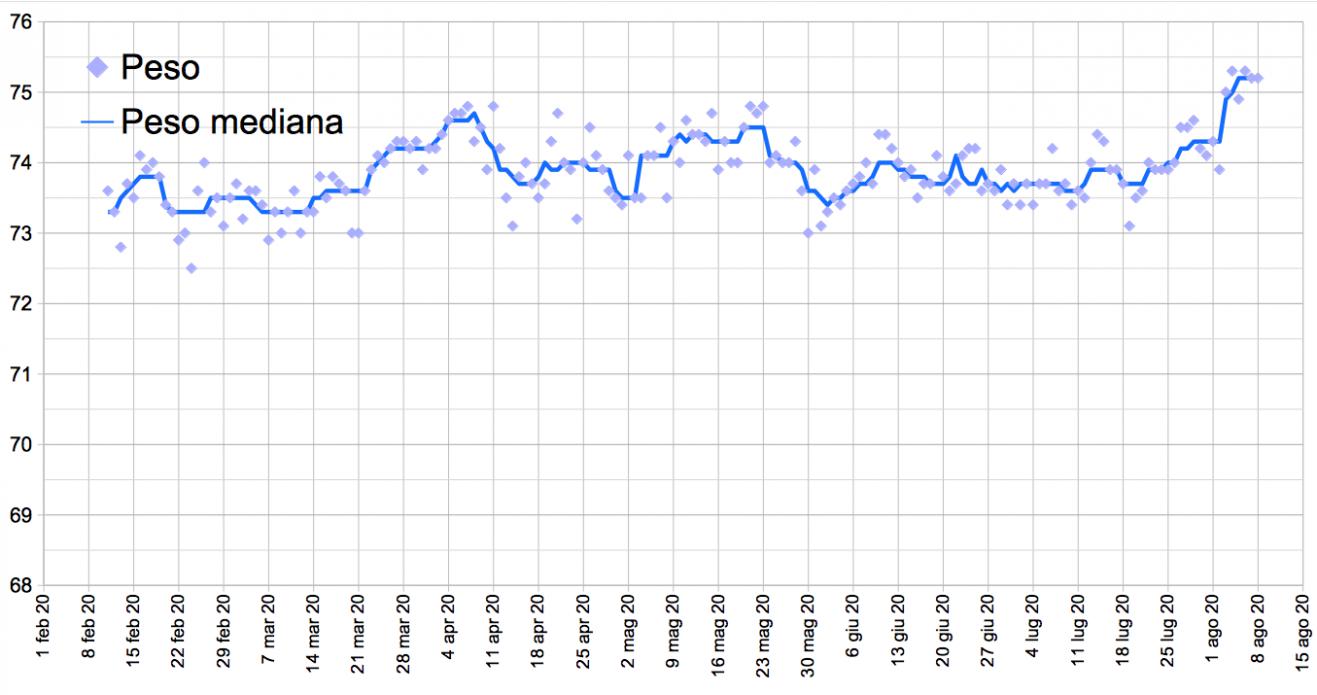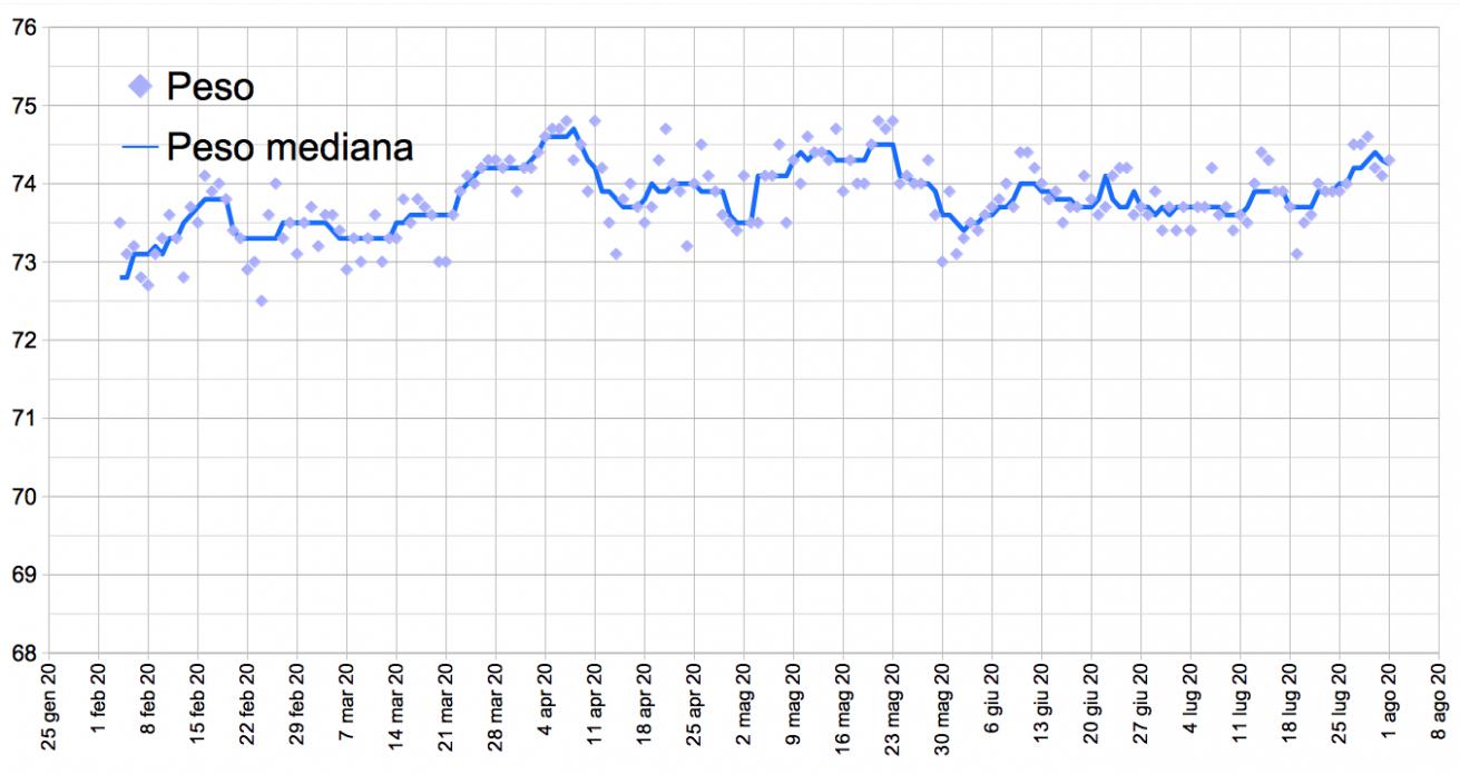 Sostanzialmente peso stabile. C'è un accenno di risalita della percentuale di grasso, speriamo di no...