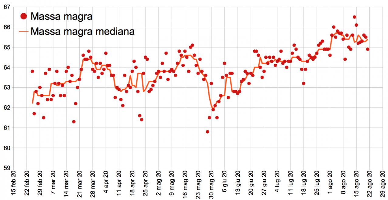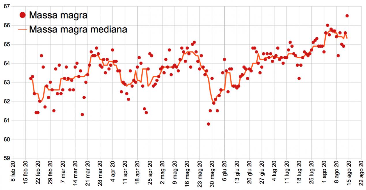 Giusto per riferimento, ecco il grafico della massa magra preso da quando ho comprato la bilancia: