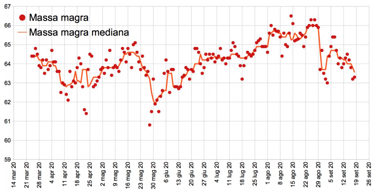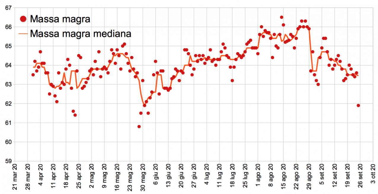La bilancia teoricamente mi indica anche la percentuale di acqua, che ho visto essere strettamente correlata con la massa magra.