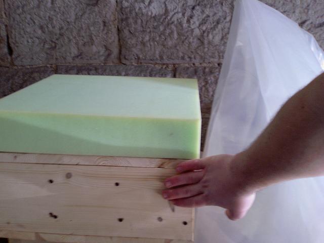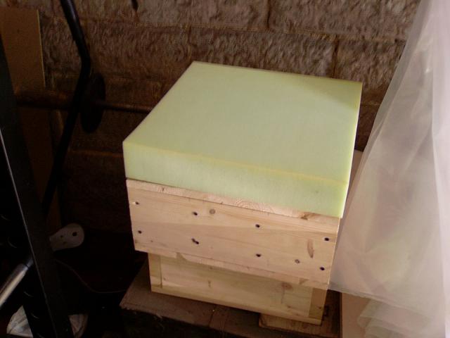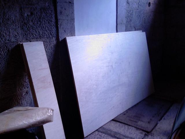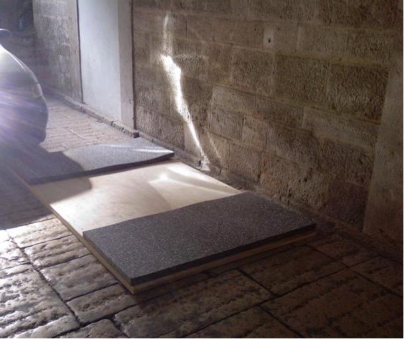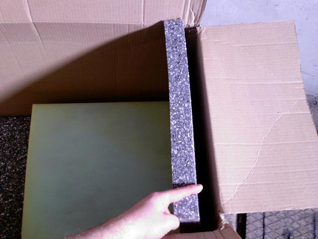 la costruzione della pedana si avvia alla conclusione. Oggi mi sono arrivati i due laterali di Poliuretano Pressato spessi 4cm (densità 140kg al metrocubo). Devo ancora incollarli, ma le foto sono gia' ora abbastanza rappresentative di quello che sara' il risultato finale. I due pezzi sono ricavati da un "foglio" di 100x200cm (costo 64euro). Il venditore mi ha anche cortesemente dato in omaggio una specie di cuscino di gommapiuma 40x40cm da mettere sul box squat (sarà spesso 8-9cm).