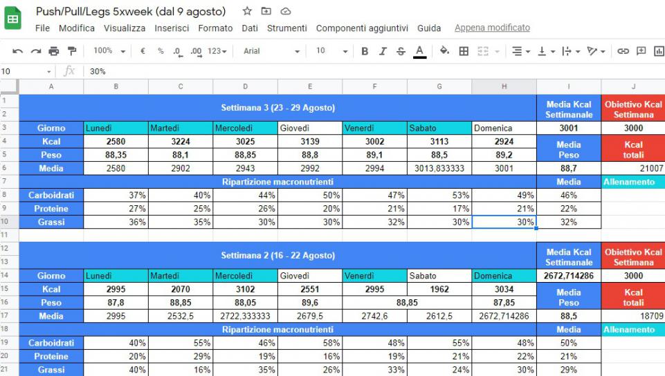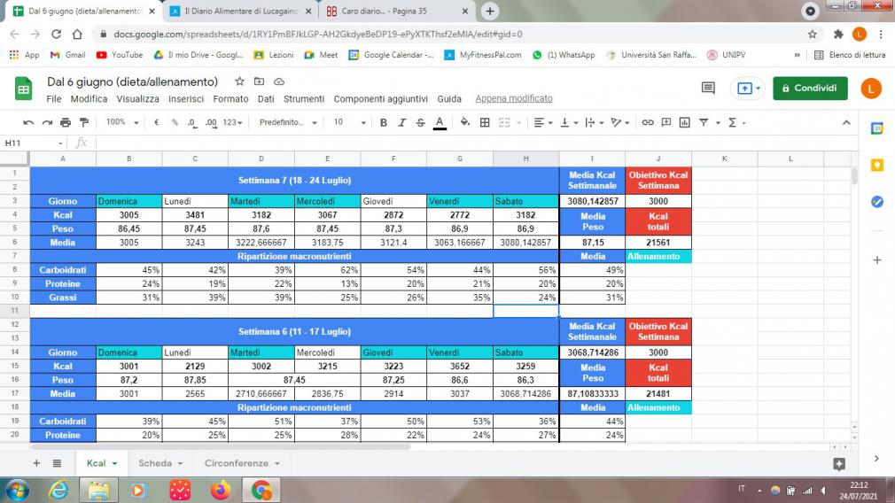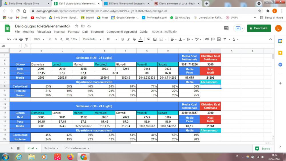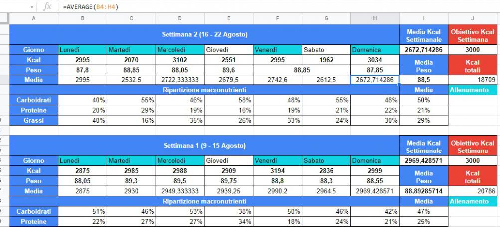 - Sempre le stesse kcal, questa volta la media del peso è salita, probabilmente un po' sono aumentato ma un po' è uno sbalzo che capita visto che la settimana scorso non era aumentato quasi di niente