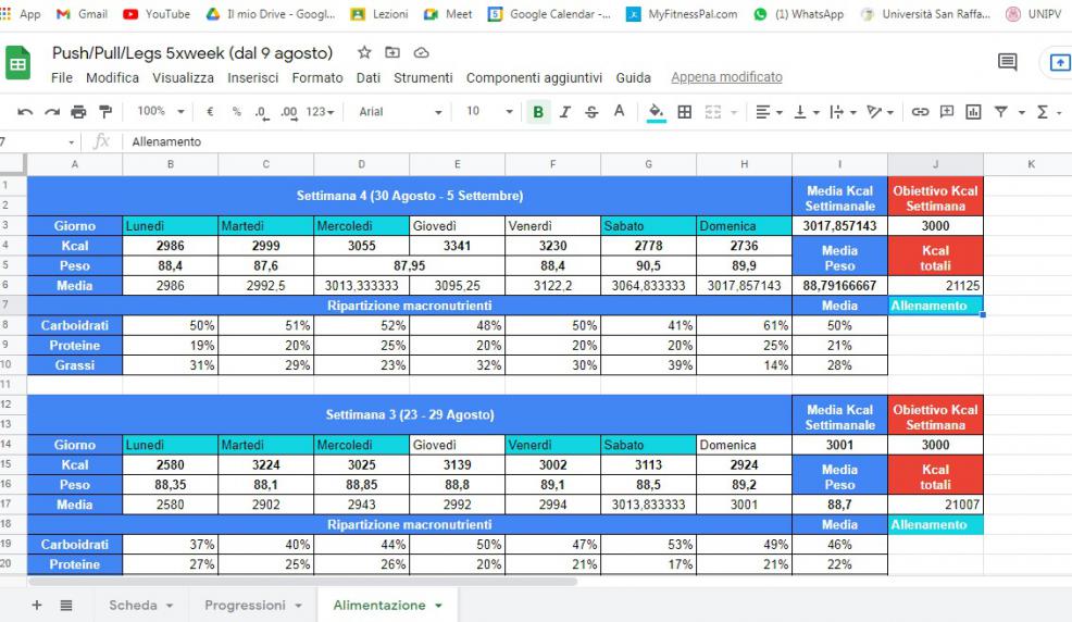 Kcal un pochino più alte, media del peso pressochè uguale. Ammetto che le 700kcal delle 3700 di ieri sono kcal sporche hahahahaha Avevo voglia di dolci dopo la piscina. Penso che ormai il grosso è stato fatto in questo mesociclo, potrei abbassare un po' le kcal in vista della settimana di scarico, non mi prometto niente perchè se ho fame mangio hahaha