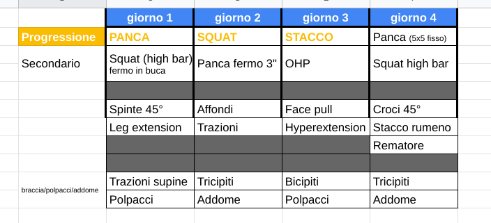Questo è quello che ho "partorito" in questi giorni, mi sono fatto influenzare un po' da Gruzza. Ovviamente voglio fare una cosa ibrida quindi con dei complementari, anche se molti meno del mio solito. La progressione per i carichi sarebbe la sua classica con la fase estensiva, intensiva e taper di 12 settimane. Il resto gira tra varianti e altri esercizi dove bene o male saprò i carichi da utilizzare in base al periodo visti gli ultimi mesi di "autoregolazione"
