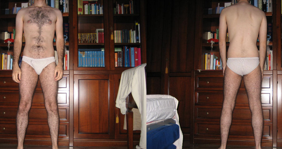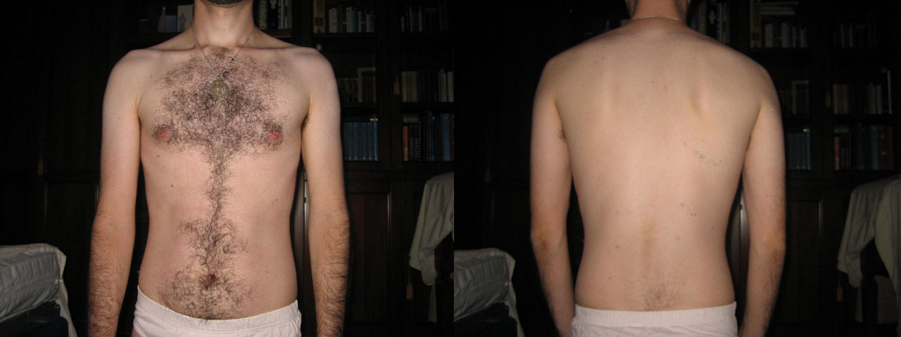Ciao a tutti, mi sono iscritto in palestra da appena una settimana quindi per piacere non disgustatevi troppo. Avrei dovuto postare le foto fra qualche mese - quando spero sembrerò più bello - per mitigare l'orrida impressione iniziale, ma guardando queste mie prime foto ho scoperto due "difetti" che non sapevo fossero così evidenti. La scapola destra è più sviluppata dell'altra, e così una spalla appare più alta mentre l'altra più bassa. Inoltre gli ossi clavicolari sono troppo mostruosamente sporgenti, eredità di flessioni adolescenziali fatte male? Vorrei sapere se con l'allenamento tutto ciò potrà essere corretto o posso pure rassegnarmi...