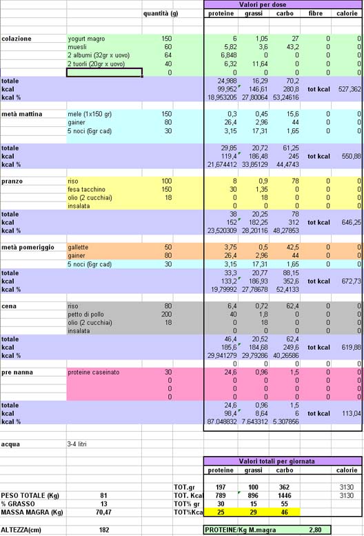 In sostanza era molto proteica e con parecchi integratori, pochissimi grassi. Le proteine erano a 3.3gr/kg massa magra.