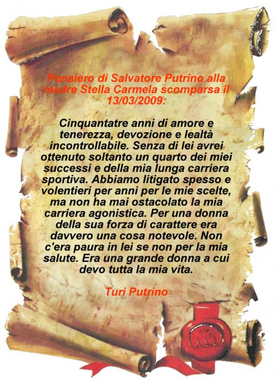 Salve a tutti, purtroppo a volte oltre alle belle notizie ne arrivano anche altre che oscurano il volto e i sentimenti.... come amico di Turi e come sportivo porgo le mie sincere condoglianze per la perdita della cara mamma nella speranza che il ricordo e il tempo gli diano la forza di continuare in quello che piu' crede come ho fatto io dieci anni fà.