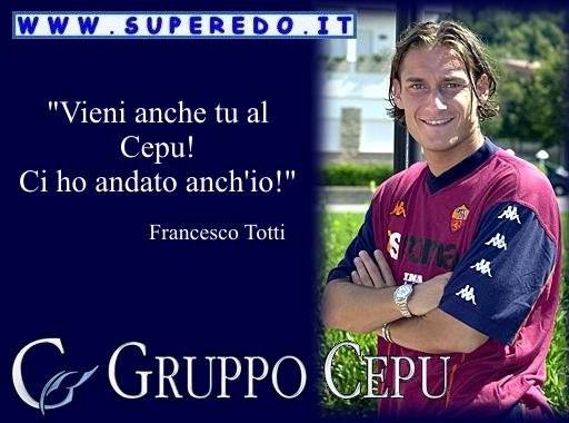 ma a parte tutto mi danno fastidio le prese in giro su Totti perchè spesso sono fatte per attaccare tutti i romani....e poi io ho avuto modo di conoscerlo personalmente ed è veramente un bravo ragazzo.....e per finire le pubblicità del CEPU le hanno fatte Del Piero e Vieri!!!....quindi come dice Frank prendiamo in giro chi se lo merita veramente.....![]()