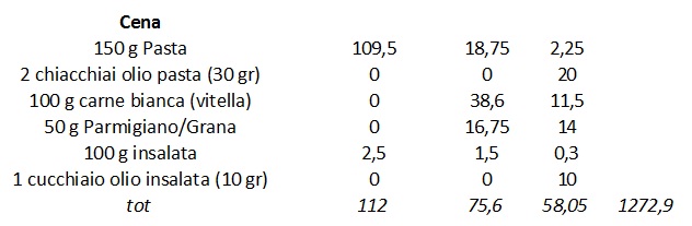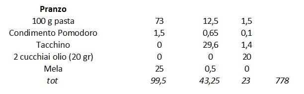 Il motivo per il quale il pranzo è così "scarno" rispetto alla cena sta nel fatto che il pranzo lo faccio quasi sempre ad una mensa e questi sono generalmente gli alimenti proposti e le grammature mentre a cena mi posso cucinare qualsiasi cosa da solo..