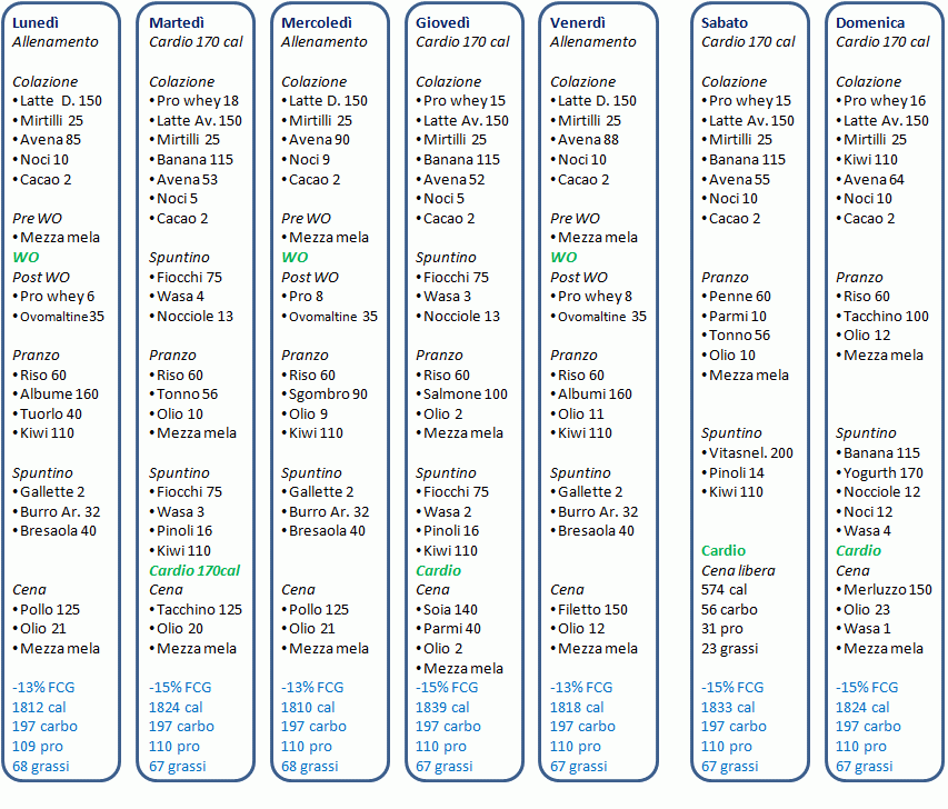 - Le quantità in grammi dei nutrienti sono le seguenti: 197g carbo, 110g pro (2g per Kg di massa magra), 67g grassi.