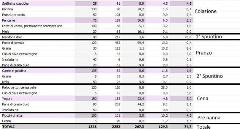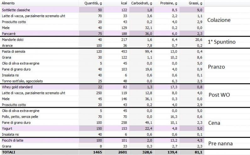 Suddivisione dei macro: 51-21-28. Calorie totali 2601