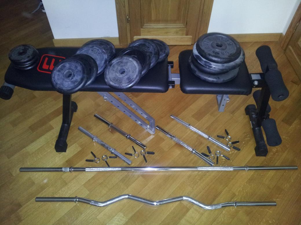Vendo (in foto) panca reclinabile, bilancere dritto ed angolato, 4 manubri con relativi fermadischi, 4 dischi da 5 kg, 4 da 8 kg, 8 da 2 kg. Il tutto a 200 euro.
