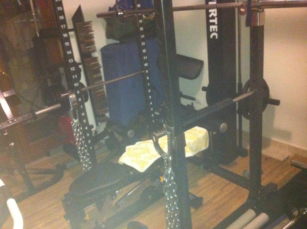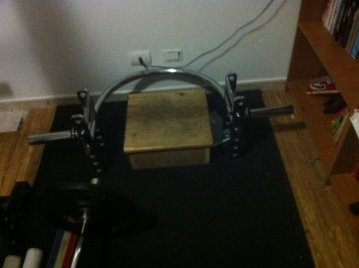 Poi volevate vedere il setup dello squatlift di ieri notte,nuova Trap Bar e quello che vedete al centro è il famigerato SGABELLOS OF DOOM (lo sgabello fan dei Manowar)
