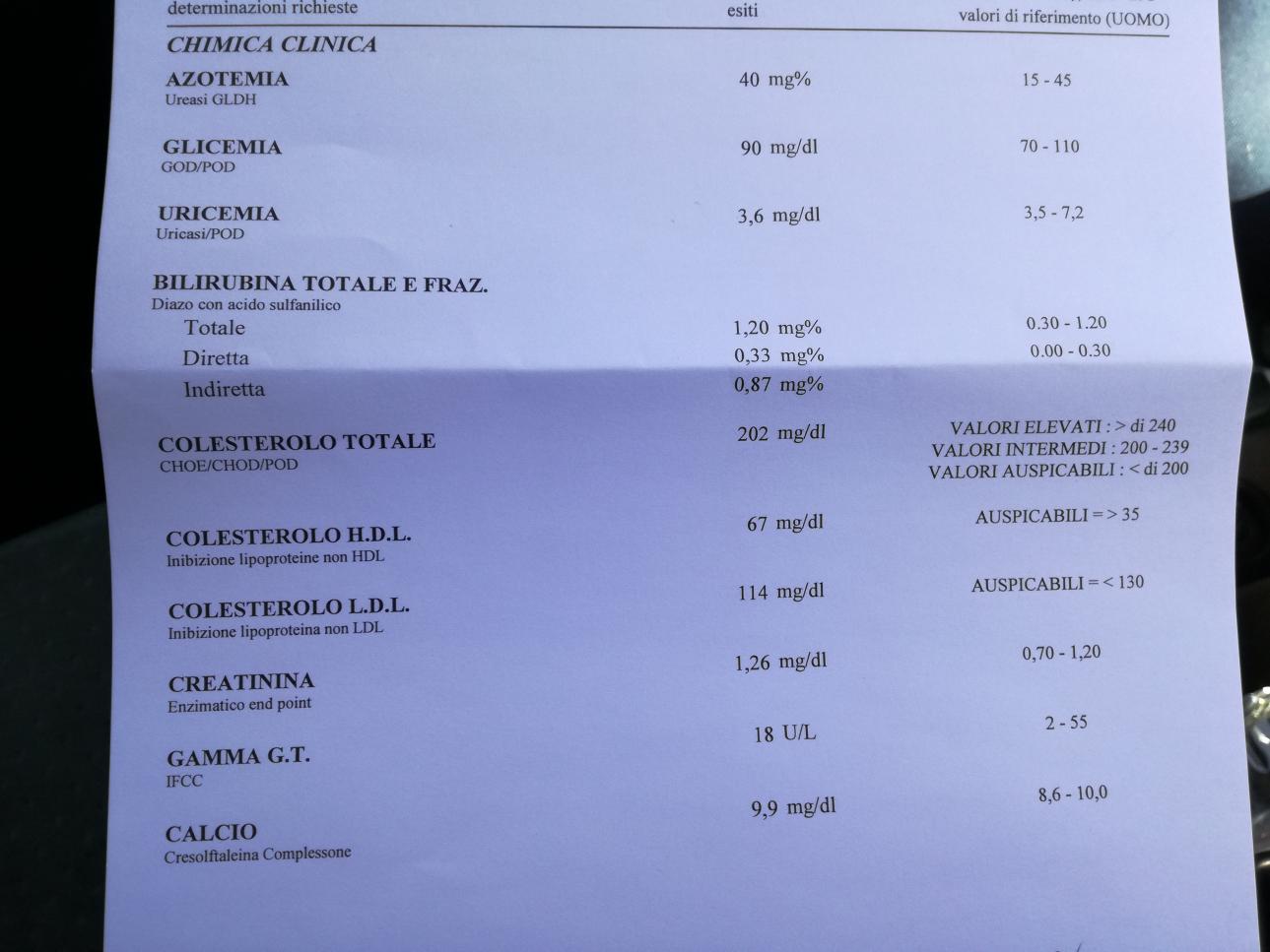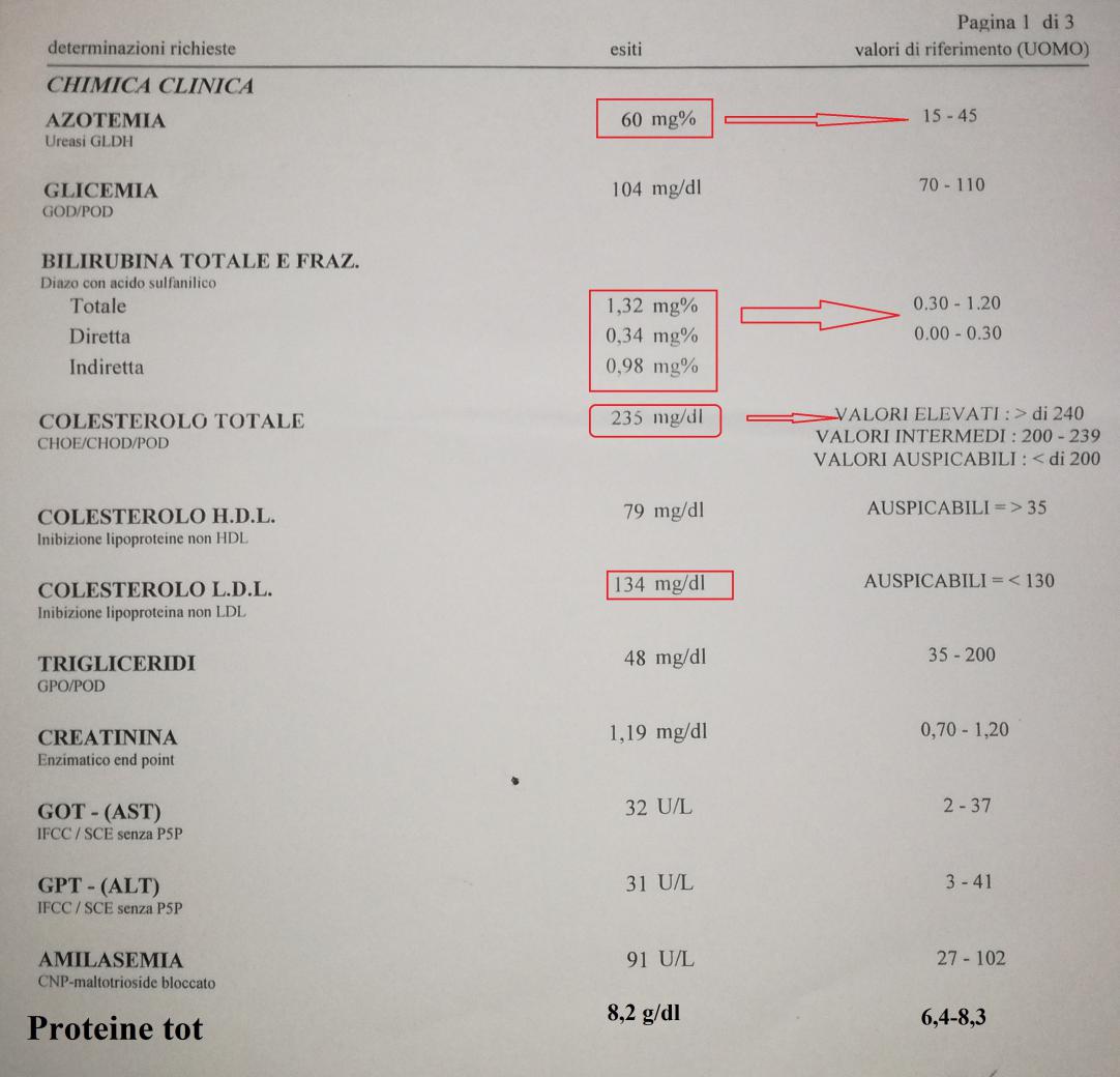 dai risultati ho modificato l'alimentazione...i carb li ho abbassati da 250 a 100/150 provenienti da riso int. Farro orzo Le prot invariate prov da pesce e poca carne Ho bevuto molta acqua 2/3L al gg.... Prima delle analisi non mi sono allenato per una settimana per non alterare la creatinina ecc. Ed ho abbassato ulteriormente le proteine...E noto con piacere che molti punti li ho centrati abbassando colesterolo/glicemia/bilirubina,abbastanza/ma non capisco come mai mi si è alzata la creatinina.
