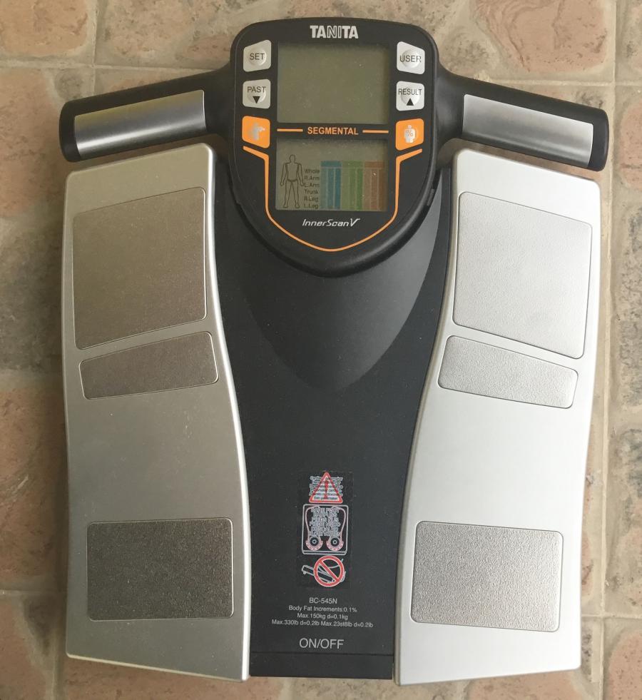 Abbiamo scelto questa perché dotata di manubrio, collegato con un filo alla base, che deve essere afferrato con entrambe le mani e tirato su, come se fosse il manubrio di una bicicletta, quando ci si pesa. Con questa configurazione, la bilancia effettua la misura impedenziometrica non solo facendo passare una debole corrente elettrica da piede a piede, ma anche tra piede e mano, tra mano e mano, ecc. Quindi la speranza è che sia un po' più affidabile delle bilance più economiche.