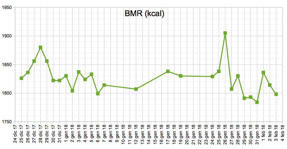 Se volete avere un'idea dell'affidabilità, vi riporto qui i grafici di peso, percentuale di grasso, massa muscolare e BMR in kcal delle misure che ho fatto finora.