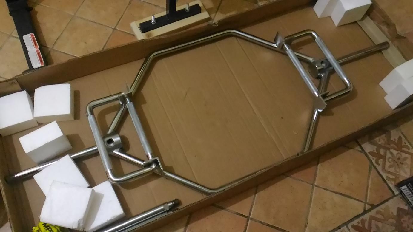 ancora nella scatola. Sono visibili i due fori con filettatura inclinata dove inserire le due barre oblique che si vedono nella scatola.
