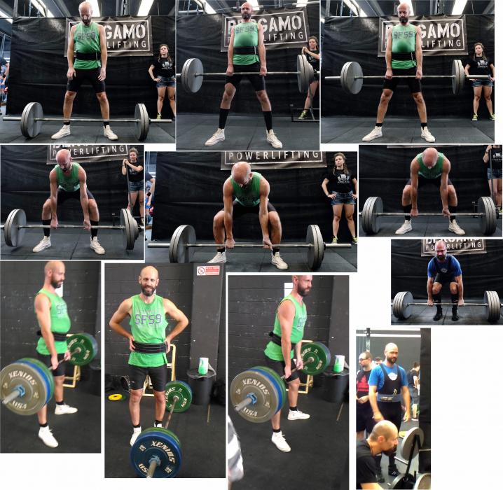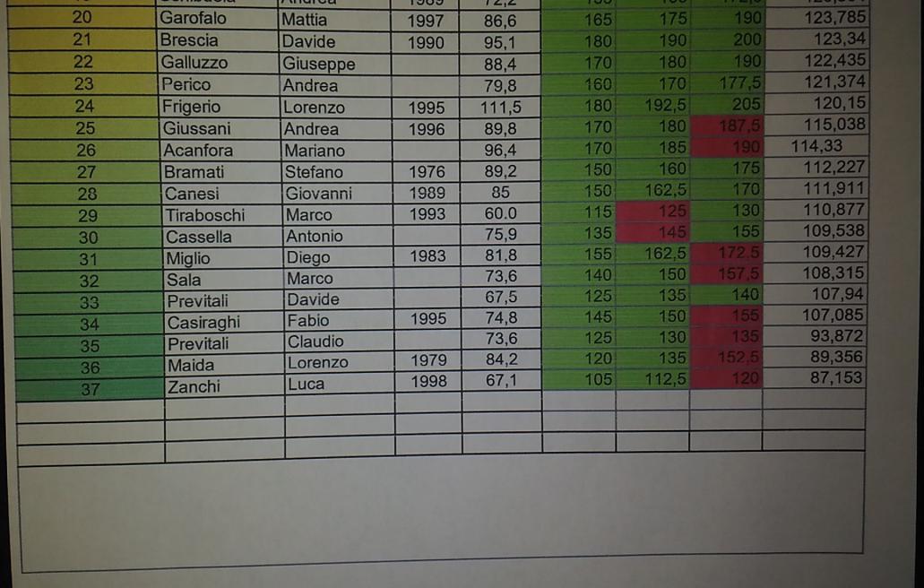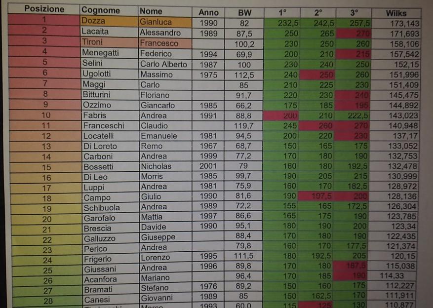 Più preoccupante la terza: 175 kg. Saliva, lentamente per la mia attuale esperienza, però vedevo che saliva. Chiusa con convinzione, l’ho riportata giù lentamente, avendo visto diversi atleti che ricevevano annullamenti perché mollavano il bilanciere prima della fine. Ho atteso di vedere il colore dei cartellini... bianchi! Era andata! Contentissimo. Che altro dire? Ed ho anche raggiunto il famoso 2.5 BW, (per la precisione 2.547... essendo il mio peso di 68.7 kg).